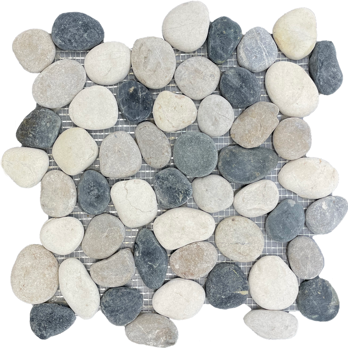 A blend of different colored stones with a natural finish so the stones have a rounded top. Best applied on shower floors or in spa areas. Once grout is applied in between the stones, the overall elevation of the pebbles is reduced providing a much more comfortable experience when walking over the stones.