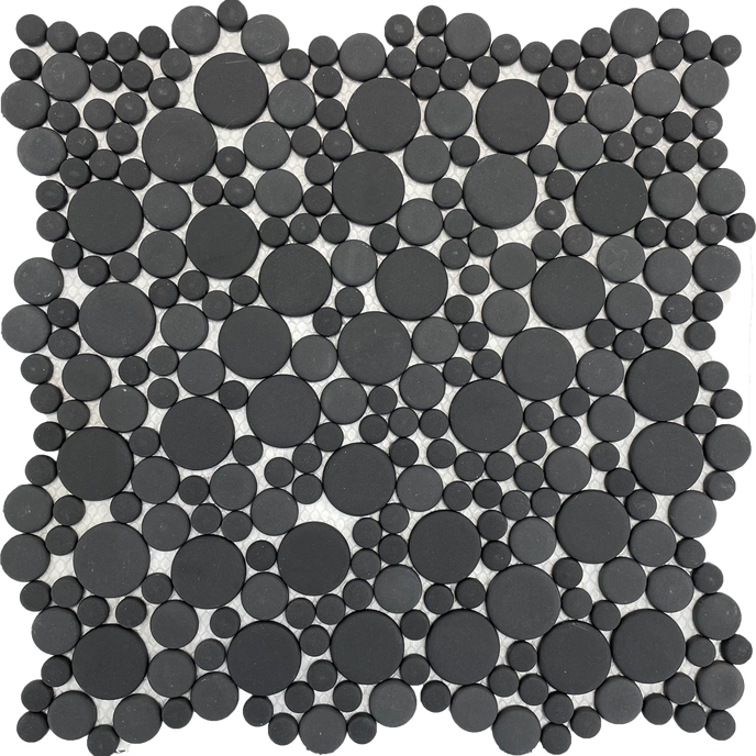 Mesh-backed recycled glass in matte black finish. Sheets interlock for a seamless look.