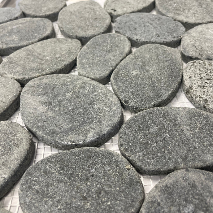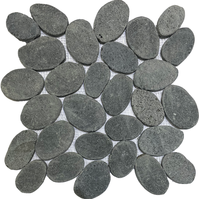 Large sliced pebbles on a mesh-backed sheet. Smooth, antislip finish. Perfect for shower floors and other spa areas.