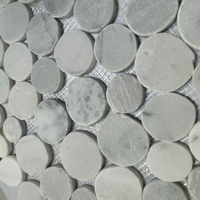 Natural Stone delicately shaped into varying sized circles. This grey stone features a natural variation and is smooth to the touch. Excellent for shower floors and spa areas