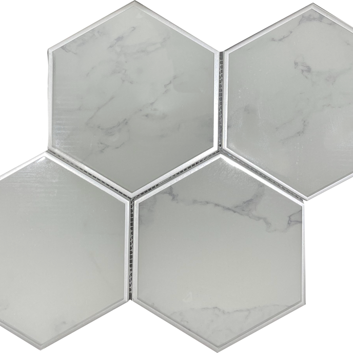 Large glass hexagon mosaic with a calacatta motif and a painted silver edge. This mosaic sheet measures 12"x10" with each individual hexagon measuring 5.5"x6.5"