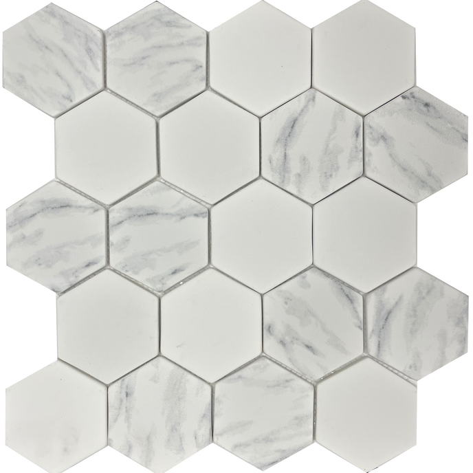 The all-purpose hexagon looks great in bathrooms, backsplashes, and floors. This matte finish hexagon tile features a mix of white and carrara chips.