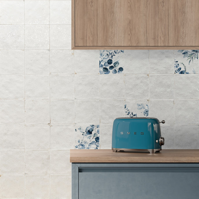 MAYOLICA is a 6"x6" porcelain collection, made up of a total of 3 models (one neutral field and two decorative). The neutral field tile acts as a versatile backcloth, fitting in with a wide variety of settings and styles. Its subtle elegance infuses living spaces with a restful sense of harmony.