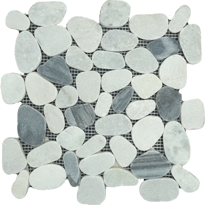 Mix of white and grey pebbles mounted on a mesh mosaic. Interlocking sheets for a seamless design. Sealant can be applied to the stone to achieve a permanent wet look.