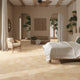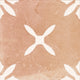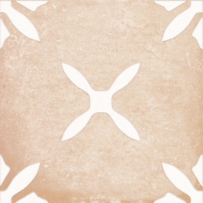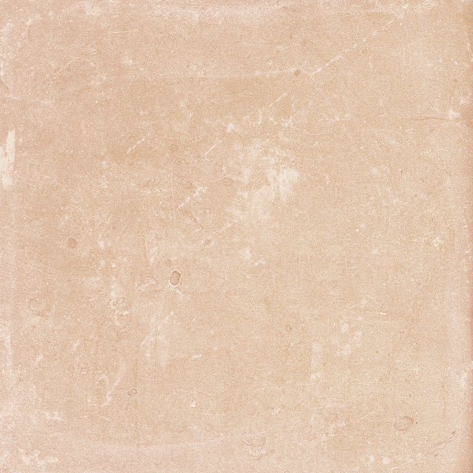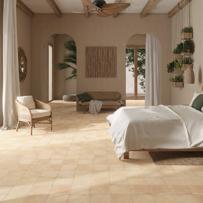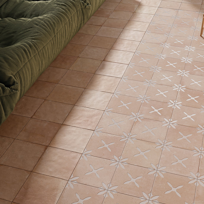 The decorative counterpart introduces an artisanal touch with a soft floral motif delicately etched across the same 9x9 surface. The light-hued pattern contrasts elegantly with the sandy backdrop, creating rhythm and visual intrigue without overwhelming the space. Its design references classic Mediterranean geometry, reinterpreted with modern subtlety, allowing it to transition seamlessly between rustic, bohemian, and minimal settings. Used in combination with the plain tile, it offers endless layout possibilities. The flower design is highlighted by a glazed finish with fine particles suspended in the glaze.