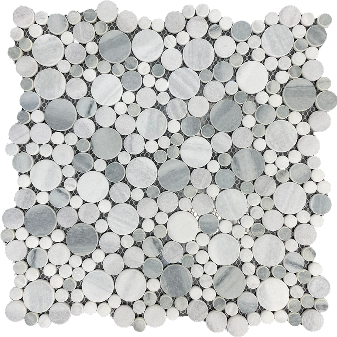 Grey mesh-backed circle mosaic made from recycled glass. Sheets have an interlocking design for a seamless final look.