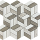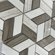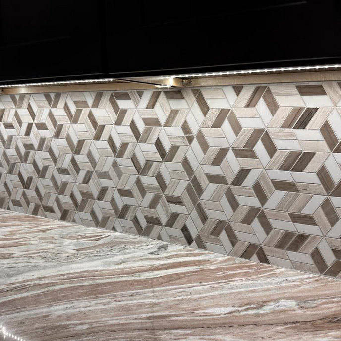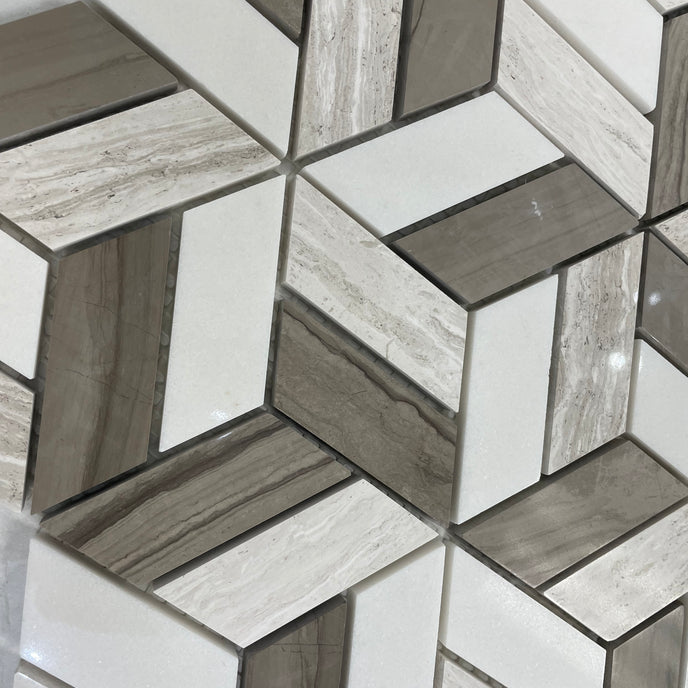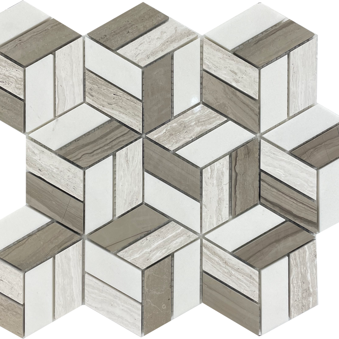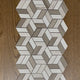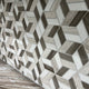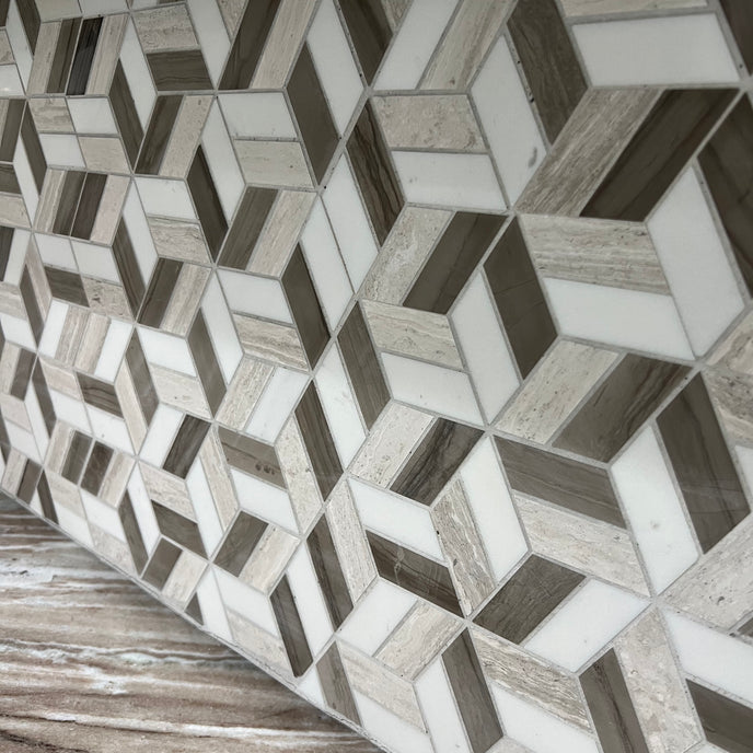 Polished haisa and white natural stone come together to form the visual illusions of hexagon and cube shapes in three different stones.
